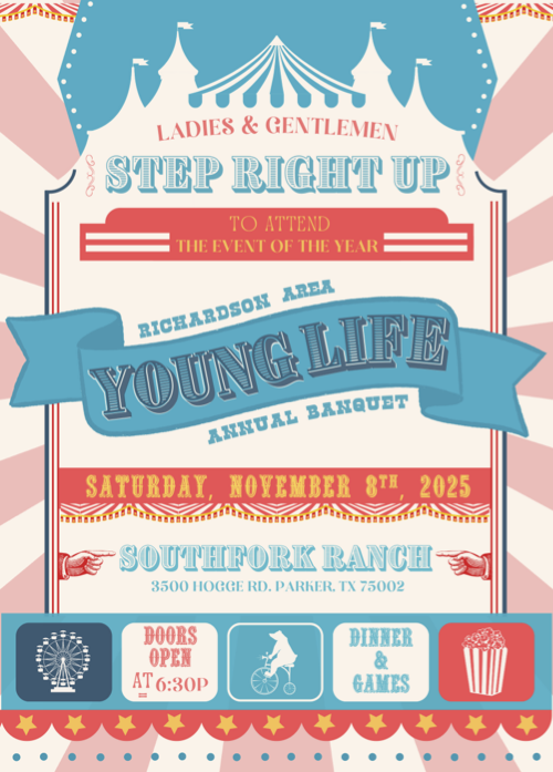 Can’t make it to the BIG TOP but still want to be part of the show? You can support Richardson Area Young Life by making a gift online or giving during the event. Every contribution keeps the lights shining bright and helps make this night unforgettable!