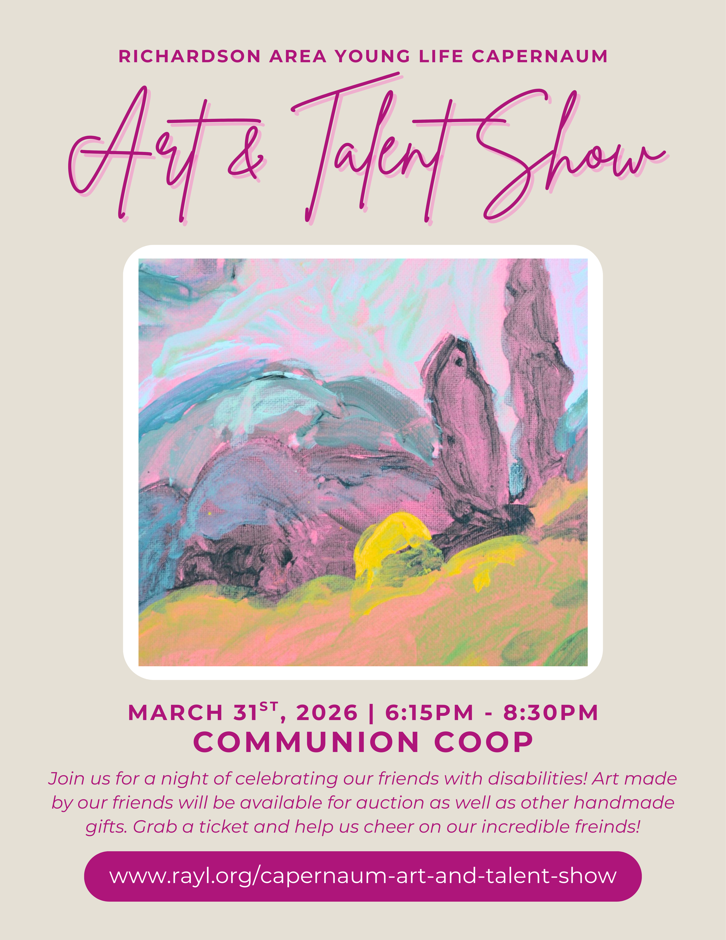 Join us on March 31st for our third annual Richardson Area Capernaum Art and Talent Showcase! Young Life Capernaum is a place where teens and young adults with intellectual and developmental disabilities are invited, celebrated, and needed. We would love for you to meet our incredible Capernaum friends and catch a glimpse of our ministry. It's going to be the best night of the year!