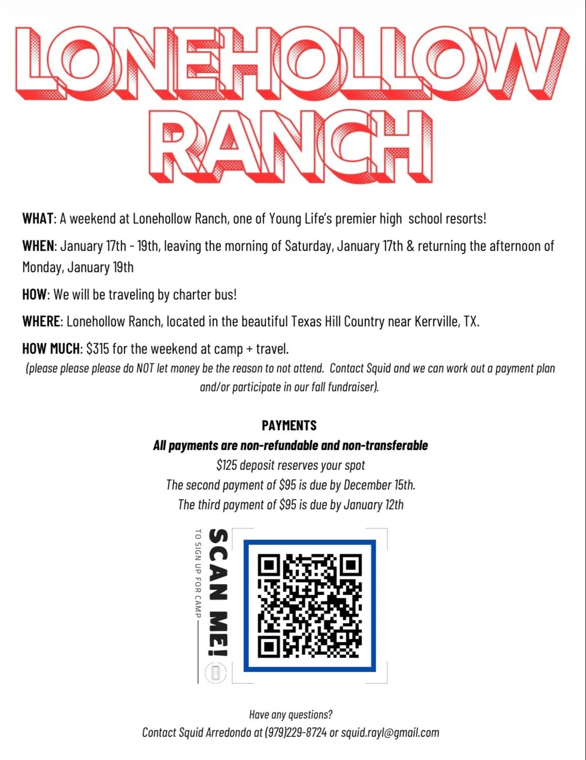 Pearce Freshmen and Sophomores will experience "The Best Weekend of Their Life" at Young Life’s Lonehollow Ranch in Vanderpool, TX. The experience includes, but is not limited to... waterfront activities, basketball and volleyball courts, horses, soccer, hiking, all meals served by waiters and waitresses, and much more!