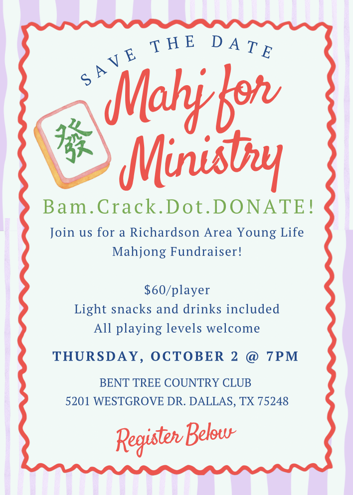We’re thrilled to invite you to our Mahjong for Ministry night! Join us for an evening of fun, fellowship, and friendly competition while supporting Young Life in Richardson. Whether you’re a seasoned player or brand new to the tiles, this event is a great way to connect with friends and be part of the mission. Tables will be filled on a first-come, first-served basis, so gather your group or register individually to be placed at a table. All proceeds help make our ministry possible! Find more details and secure your spot at the link below.
